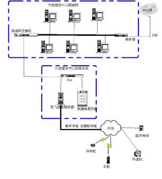 政府群眾一線(xiàn)通”系統(tǒng)可以通過(guò)局域網(wǎng)連入行政中心局域網(wǎng)交換機(jī),從而實(shí)現(xiàn)與整個(gè)行政服務(wù)中心的信息共享和熱線(xiàn)系統(tǒng)服務(wù)內(nèi)容的自動(dòng)更新。具體網(wǎng)絡(luò)拓?fù)浣Y(jié)構(gòu)如下: