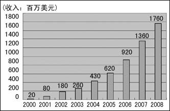 IP PBX亞太市場2000年~2008年預測增長圖