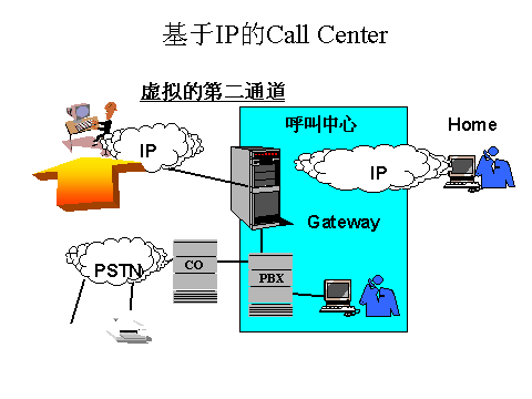 目前擁有呼叫中心基礎(chǔ)設(shè)施(這些設(shè)施包括自動呼叫分配器ACD、IVR系統(tǒng)或呼叫管理系統(tǒng))的企業(yè)安裝一個互聯(lián)網(wǎng)電話網(wǎng)關(guān)作為通向ACD或呼叫中心轉(zhuǎn)換的前端。網(wǎng)關(guān)作為公用電話交換網(wǎng)與互聯(lián)網(wǎng)絡(luò)之間的橋梁,使呼叫中心能夠向客戶和潛在客戶傳送同步語音和數(shù)據(jù)服務(wù),所有這一切都通過一條電話線。按數(shù)字顯示,網(wǎng)關(guān)可通過模擬線路與現(xiàn)有設(shè)備連接,或通過數(shù)字線路與多媒體PC連接。這使得呼叫中心能夠利用其現(xiàn)有設(shè)備,工作人員培訓(xùn)和呼叫管理活動中的原有投資。