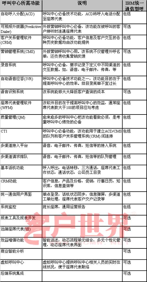 對于統(tǒng)一通信型呼叫中心的功能概況,筆者以IBM統(tǒng)一通信型呼叫中心提供的功能為例,供企業(yè)客戶及合作伙伴參考(見表二)。