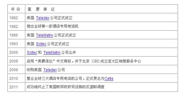 Cetis(美爵信達(dá)) 是全球酒店客房/辦公電話機(jī)的領(lǐng)導(dǎo)企業(yè),全球總部位于美國(guó)丹佛,在世界各地設(shè)有生產(chǎn)基地、銷售網(wǎng)絡(luò)及服務(wù)機(jī)構(gòu),并在全球擁有7000多家授權(quán)代理商。2009年12月18日,Cetis(美爵信達(dá))在全球 CEO 孫炳南博士的領(lǐng)導(dǎo)下,正式收購了全球最大的酒店專用電話機(jī)公司—— 美國(guó)Teledex(德利達(dá))公司,成為世界上最大、擁有全球酒店客房話機(jī)三大頂級(jí)品牌公司的龍頭企業(yè)。