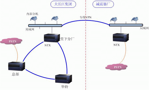 大長江集團(tuán)采用佳和融合通信系統(tǒng)設(shè)備,組建集團(tuán)的電話通信網(wǎng)絡(luò),并與合作伙伴“減震器廠”也實(shí)現(xiàn)了組網(wǎng),網(wǎng)絡(luò)拓?fù)鋱D如下: