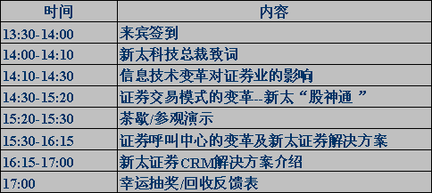與高交會(huì)同期的還有10月15日下午在投資大廈4樓多功能廳舉行的新太“股神通”產(chǎn)品發(fā)布會(huì)暨證券業(yè)務(wù)解決方案研討會(huì)(詳細(xì)情況請(qǐng)看邀請(qǐng)函)。