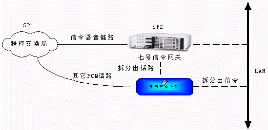 從程控端局送出來的信令和話路通過不同的PCM傳輸,信令鏈路接到七號信令網(wǎng)關(guān)轉(zhuǎn)換,通過消息方式傳遞到呼叫中心平臺,而話路則直接通過PCM線連接到電信平臺上進行話路連接。這種方式結(jié)構(gòu)明晰,有利于系統(tǒng)管理,大大增強了系統(tǒng)容量的擴展能力。