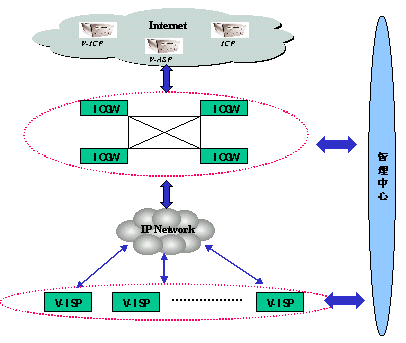 整個(gè)語音互聯(lián)網(wǎng)由V-ISP接入服務(wù)平臺(tái)、ICGW信息控制關(guān)口、V-ICP內(nèi)容提供平臺(tái)、管理平臺(tái)四部分組成。這四部分分別完成不同的功能。