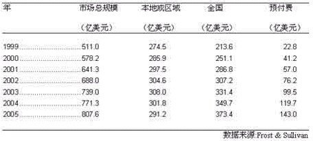 本地或區(qū)域價(jià)格方案在我們預(yù)測(cè)的時(shí)期內(nèi), 將始終是手機(jī)用戶采納的最多的一種方案。 1999年,在美國有5千7百 萬,大約70%的用戶是采用本地或區(qū)域方案, 而該方案產(chǎn)生的營業(yè)額為274.5億美元, 約占市場(chǎng)總規(guī)模的58.6%。Frost & Sullivan 預(yù)計(jì),到2005年, 46.6%的手機(jī)用戶還會(huì)使用該種方案, 而該方案產(chǎn)生的營業(yè)額將為291.2億美元,占市場(chǎng)總規(guī)模的比例將縮至36.1%。