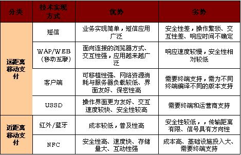 移動支付(Mobile payment)包括遠(yuǎn)距離方式和近距離方式。遠(yuǎn)距離移動支付的主要技術(shù)實現(xiàn)方式有SMS、WAP、客戶端(手機軟件)和USSD;近距離移動支付的主要技術(shù)實現(xiàn)方式有紅外和NFC。各種移動支付業(yè)務(wù)技術(shù)實現(xiàn)方式優(yōu)劣勢比較詳見圖表1。