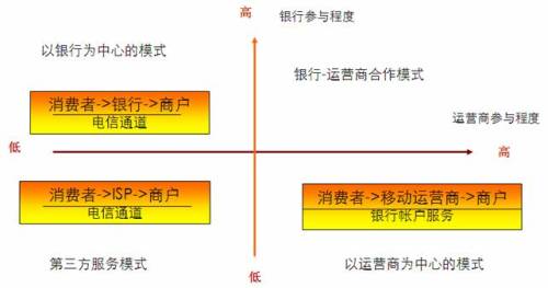 從產(chǎn)業(yè)鏈環(huán)節(jié)上看,移動支付的主要參與者主要包括:消費者、平臺提供商、銀行、運營商和商戶。其中,銀行和運營商在其中具有較高的談判能力。因此,可以按照這兩者在產(chǎn)業(yè)鏈中的參與程度,劃分移動支付的商業(yè)模式。總的來說,銀行機構(gòu)管理著廣大用戶的資金帳戶,擁有完善的支付體系,在支付領(lǐng)域具有天然的用戶信任。運營商則擁有完備的網(wǎng)絡(luò)設(shè)施和先進(jìn)的IT系統(tǒng),通過定制終端,運營商可以將各種先進(jìn)的移動應(yīng)用提供給用戶,使用戶獲得良好的移動化生活體驗。因此,運營商在這方面具有較好的用戶資源和營銷渠道。