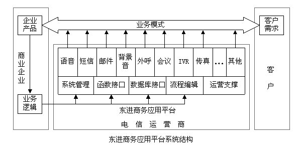 從應(yīng)用角度看,東進(jìn)商務(wù)應(yīng)用平臺(tái)將業(yè)務(wù)分為3個(gè)部分--企業(yè)端的業(yè)務(wù)邏輯、電信運(yùn)營(yíng)商端的業(yè)務(wù)實(shí)現(xiàn)和客戶端業(yè)務(wù)響應(yīng)。企業(yè)根據(jù)其產(chǎn)品特點(diǎn),制定相應(yīng)的業(yè)務(wù)邏輯,去控制電信運(yùn)營(yíng)商的商務(wù)應(yīng)用平臺(tái),平臺(tái)在業(yè)務(wù)邏輯的控制下,去響應(yīng)客戶端的業(yè)務(wù)需求,由此組成一個(gè)智能化的業(yè)務(wù)模式。