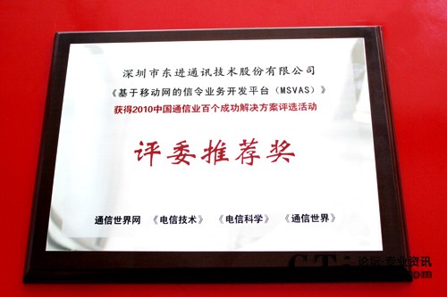 從2010年7月起評選進(jìn)入征集階段,經(jīng)過長達(dá)3個月的層層篩選,最終百個成功解決方案出爐,并由多家主流媒體公示。東進(jìn)技術(shù)“基于移動網(wǎng)的信令業(yè)務(wù)開發(fā)平臺(MSVAS)”解決方案憑借出眾的實用經(jīng)濟性、安全可靠性、靈活性和成熟性,經(jīng)過兩個月網(wǎng)絡(luò)初選,和近百位運營商層面專業(yè)人士組成的組委會技術(shù)終選后獲此殊榮。