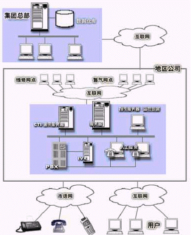 各地區(qū)系統(tǒng)通過互聯(lián)網(wǎng)和下屬維修網(wǎng)點、銷售網(wǎng)點相連,構(gòu)成一個地區(qū)性服務(wù)網(wǎng)絡(luò)。各地區(qū)系統(tǒng)通過互聯(lián)網(wǎng)和集團總部連接,構(gòu)成信息收集網(wǎng)絡(luò)。前者支持業(yè)務(wù)服務(wù),后者支持管理決策,共同構(gòu)成綜合公用事業(yè)服務(wù)平臺。