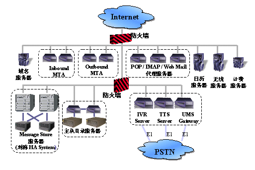 UMS系統(tǒng)的軟件采用Blue-Sillicon公司的UMS軟件,郵件系統(tǒng)為iPlanet Message Server 5.0(iMS 5.0)。Blue-Silicon公司的UMS軟件實現(xiàn)了上面我們所描述的功能,將電話、傳真和郵件和為一體,為用戶提供方便快捷的全方位信息服務(wù)。