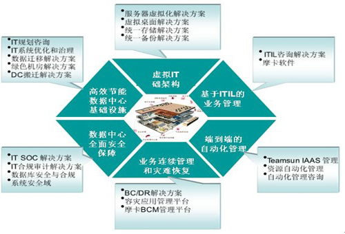 圍繞云計(jì)算數(shù)據(jù)中心的建設(shè),華勝天成共開(kāi)發(fā)了多個(gè)解決方案,且每個(gè)解決方案均有專(zhuān)業(yè)的售前支持團(tuán)隊(duì)和售后實(shí)施團(tuán)隊(duì),這些解決方案不是分散而無(wú)關(guān)的,而是針對(duì)用戶(hù)的不同情況,在各方面均給予綜合考慮,以最優(yōu)的設(shè)計(jì)方案來(lái)滿(mǎn)足用戶(hù)的需要,并兼顧另外方面的后繼需求。