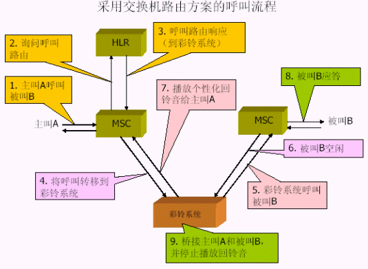 1. 交換機(jī)方式對(duì)現(xiàn)有的移動(dòng)交換機(jī)進(jìn)行了流程改造,并添加了彩鈴智能外設(shè)進(jìn)行業(yè)務(wù)流程控制和業(yè)務(wù)數(shù)據(jù)維護(hù)