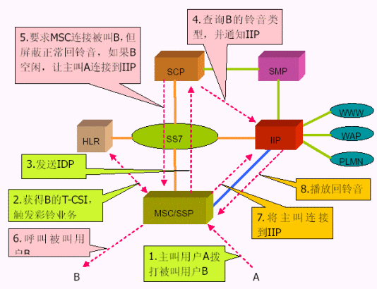 3. 智能網(wǎng)方式使用移動(dòng)智能網(wǎng)中的信令控制節(jié)點(diǎn)(SCP)實(shí)現(xiàn)智能業(yè)務(wù)的業(yè)務(wù)邏輯,新增的智能外設(shè)用于為用戶提供回鈴音和用戶管理功能。 個(gè)性化回鈴音業(yè)務(wù)是基于智能網(wǎng)系統(tǒng)的一個(gè)新業(yè)務(wù),在智能網(wǎng)中增加新的業(yè)務(wù)控制點(diǎn)(SCP)和獨(dú)立智能外設(shè)(IIP)。為此只需要為此業(yè)務(wù)加入基于Intel平臺(tái)的SCP和IP即可,前者是智能網(wǎng)體系中的業(yè)務(wù)控制設(shè)備,用于實(shí)現(xiàn)智能業(yè)務(wù)的業(yè)務(wù)邏輯,使用的是Intel高性能的c-PCI平臺(tái),支持高可靠性的冗余備份,提供業(yè)務(wù)呼叫控制和業(yè)務(wù)數(shù)據(jù)維護(hù)功能;后者是智能網(wǎng)獨(dú)立外設(shè),使用的是Inetl Dialogic的相關(guān)語(yǔ)音板卡,用于為個(gè)性化回鈴音用戶提供語(yǔ)音(回鈴音)、以及業(yè)務(wù)管理等功能。優(yōu)點(diǎn)是無(wú)須改動(dòng)現(xiàn)網(wǎng)上MSC/SSP 的軟件,通過(guò)采用SCP 查詢被叫用戶狀態(tài)的方式,只有當(dāng)被叫用戶處于空閑的情況下,才使用IIP 進(jìn)行處理,可以減少系統(tǒng)負(fù)荷,降低SSP 與IIP 之間話路的占用。缺點(diǎn)是需要MSC支持智能網(wǎng)業(yè)務(wù)。