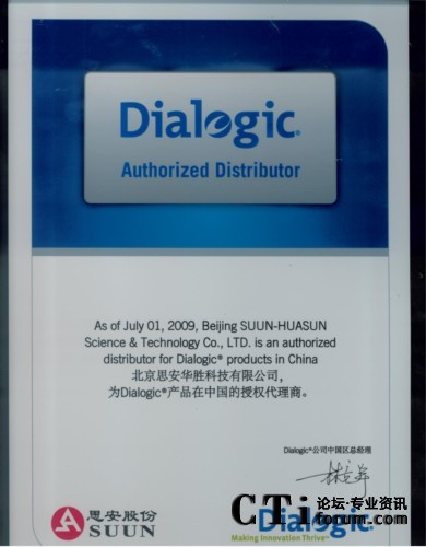 2009年7月1日DIALOGIC公司為其大陸地區(qū)DIALOGIC產(chǎn)品總代理-------北京思安華勝科技有限公司頒發(fā)了09版的代理證書(shū),新的代理證書(shū)不僅在版面和內(nèi)容上與以往有所不同,更重要的是說(shuō)明了代理的產(chǎn)品范圍(由于新近收購(gòu)的NMS、Cantata等產(chǎn)品,國(guó)內(nèi)原來(lái)就有代理商,現(xiàn)在所有產(chǎn)品都在Dialogic旗下,為了避免發(fā)生混淆和誤會(huì),本次的代理證書(shū)增加了附頁(yè),附頁(yè)里面規(guī)定了代理商所代理的產(chǎn)品的范圍,我們歡迎朋友們以各種形式來(lái)我公司或Dialogic公司北京代表處咨詢(xún)和驗(yàn)證)。此舉強(qiáng)調(diào)了渠道的正規(guī)性和權(quán)威性,北京思安華勝公司目前是DIALOGIC公司原DIALOGIC系列產(chǎn)品在中國(guó)的唯一總代理,承擔(dān)著Dialogic系列產(chǎn)品的銷(xiāo)售、市場(chǎng)推廣、技術(shù)支持、售后服務(wù)、保修服務(wù)等一系列重要工作。