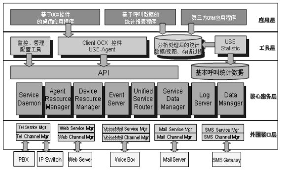 青牛USE從體系結(jié)構(gòu)上分為四個層次。第一層為外圍接口層,負(fù)責(zé)接入、抽象和發(fā)布來自不同渠道的服務(wù)請求;第二層是核心服務(wù)層,它是青牛USE軟件的核心部分,對來自不同渠道的服務(wù)請求和服務(wù)回復(fù)進行統(tǒng)一的服務(wù)排隊管理、資源調(diào)度管理、日志數(shù)據(jù)管理等,屏蔽了不同渠道的物理特性,真正實現(xiàn)統(tǒng)一路由、統(tǒng)一管理;第三層是工具層,是青牛USE提供給應(yīng)用開發(fā)商和集成商的開發(fā)接口和配置工具;第四層,USE產(chǎn)品的應(yīng)用層,為呼叫中心應(yīng)提供應(yīng)用功能,比如:呼叫統(tǒng)計分析、呼叫監(jiān)控等。