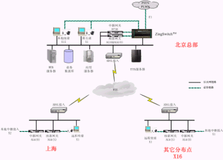 系統(tǒng)在北京總部部署了一套英立訊的ZingSwitch一體化交換機,采用高度集成的ALL-IN-ONE方式提供了PABX、ACD、CTI