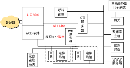 本方案的主要應(yīng)用平臺(tái)包括:Meridian 1 Option 11 mini ISDN數(shù)字程控交換機(jī)(配ACD軟件包)、交互式語音應(yīng)答系統(tǒng)(IVR)、計(jì)算機(jī)電話集成系統(tǒng)(CTI)、座席、呼叫管理系統(tǒng)、錄音監(jiān)控系統(tǒng)、數(shù)據(jù)庫服務(wù)器、應(yīng)用網(wǎng)關(guān)、WWW服務(wù)器、網(wǎng)絡(luò)系統(tǒng),其邏輯結(jié)構(gòu)下圖所示。
