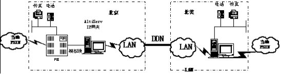 3、系統(tǒng)結(jié)構(gòu):北京新浪在Nortel交換機與AltiServ網(wǎng)關(guān)之間采用模擬線連接,AltiServ通過網(wǎng)卡接入LAN后,再通過數(shù)層路由器接入北京與北美的DDN專線。