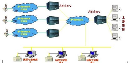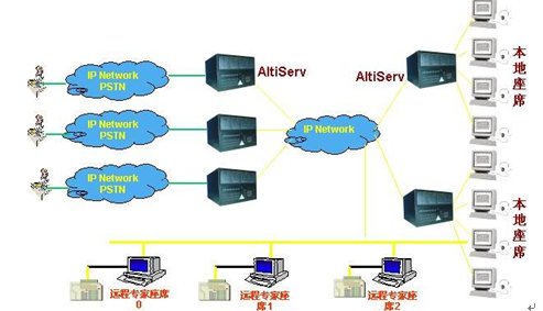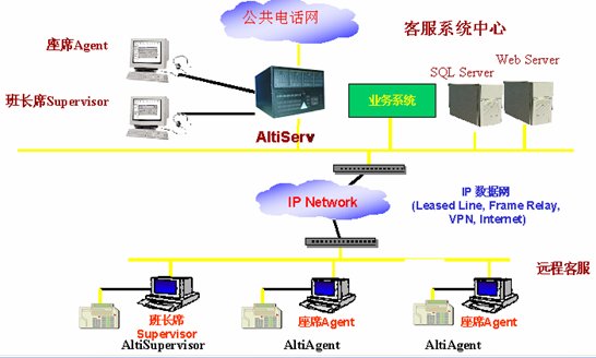 這種組合節(jié)省管理成本,因為所有的座席員都在一點,便于管理控制,同時用戶只要撥打本地電話即可進入系統(tǒng)接收服務(wù),如需人工座席應(yīng)答的話系統(tǒng)會自動將來電通過Internet轉(zhuǎn)接到座席員處,對公司的話費成本也較低(都是通過Internet實現(xiàn)的長途轉(zhuǎn)接功能)。同時AltiGen也支持通過IP分機的方式遠程登錄到系統(tǒng)實現(xiàn)遠程座席的功能,這樣對有些高級話務(wù)員或?qū)<易,不必每天到公司上班,可以通過家里的電腦登錄到AltiGen系統(tǒng),作為系統(tǒng)的一個分機來完成所有的座席員的功能,在他的電腦屏幕上也能彈出來電人的信息。系統(tǒng)的組網(wǎng)圖如下: