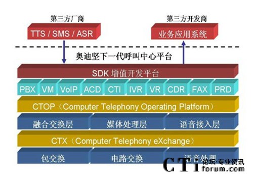 傳統(tǒng)型的語(yǔ)音交換機(jī)在設(shè)計(jì)之初,只側(cè)重于語(yǔ)音交換能力,并沒(méi)有考慮到呼 叫中心這種需要集成數(shù)據(jù)的應(yīng)用模式,因此基于傳統(tǒng) TDM 交換機(jī)的呼叫中心系 統(tǒng)都需要外掛 CTI 服務(wù)器,至于基于語(yǔ)音板卡、傳統(tǒng)型 IP-PBX 或軟交換的呼叫 中心系統(tǒng)也不例外。而奧迪堅(jiān) IP 呼叫中心平臺(tái)在設(shè)計(jì)伊始,就專門針對(duì)于呼叫 中心的應(yīng)用,在底層已經(jīng)將 PBX、CTI、IVR 等核心功能緊密地融合在一起了, 在系統(tǒng)集成度方面遠(yuǎn)遠(yuǎn)優(yōu)于傳統(tǒng) TDM 交換機(jī)、語(yǔ)音板卡、傳統(tǒng)型 IP-PBX 或軟 交換的解決方案。