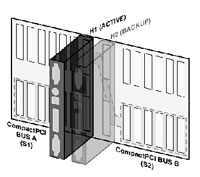 服務(wù)器刀片間的熱備份 背板的各種總線往往會(huì)分成兩段,每段有不同的SBC控制。在背板上存在兩個(gè)特殊槽位,在這些槽位上的SBC同時(shí)連接到這兩段總線上,正常狀態(tài)下一個(gè)活動(dòng)的SBC在控制兩段總線和總線上的設(shè)備,另一個(gè)SBC處在備份狀態(tài),如果活動(dòng)的SBC出現(xiàn)故障,備份SBC會(huì)接管兩段總線和應(yīng)用。參見圖2。