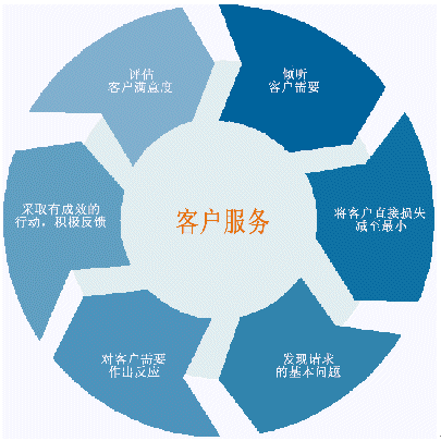 客戶服務(wù)不僅限于把公司提供給客戶使用?蛻舴⻊(wù)是與客戶交互的一個(gè)完整過程,包括聽取客戶的問題和要求,對(duì)客戶的需要作出反應(yīng)并探詢客戶新的需求。我們真的不能將其看成一個(gè)簡(jiǎn)單的過程。客戶服務(wù)可以用一個(gè)復(fù)雜的循環(huán)來表示,其中不僅僅包括了客戶和客戶服務(wù)部門,實(shí)際上包括了整個(gè)公司,即把公司整體作為一個(gè)受客戶需求驅(qū)動(dòng)的對(duì)象。