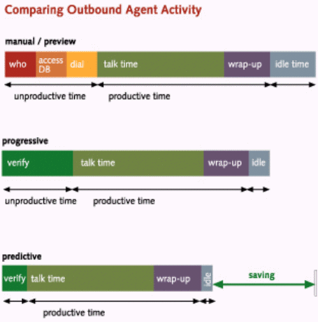 預(yù)覽撥號(hào) 在坐席代表與客戶交談之前必須要知道客戶情況時(shí)使用。預(yù)覽撥號(hào)比手工撥號(hào)效率稍高一些,因?yàn)榭蛻舻脑敿?xì)信息會(huì)呈現(xiàn)在坐席代表屏幕上并且呼叫僅在坐席代表準(zhǔn)備好時(shí)才會(huì)撥出。預(yù)覽撥號(hào)節(jié)約了撥電話號(hào)碼的"手指時(shí)間"并且能夠增加聯(lián)絡(luò)列表管理的效率。然而,總體來說坐席代表的通話時(shí)間典型地在大約每小時(shí)18到20分鐘。