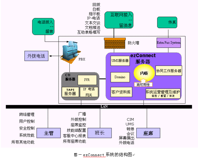 ezConnect系統(tǒng)是由訊泰信息科技公司的北京研發(fā)中心設(shè)計開發(fā)出來的一個成熟的多媒體呼叫中心產(chǎn)品。支持傳統(tǒng)電話、web、電子郵件、傳真、語音郵件、IP電話、短消息、WAP等用戶接入方式;對客戶請求采用基于座席技能的智能分派;提供文本交談、白板共享、協(xié)同填表、文檔推送、IP電話、短消息發(fā)送等多種實時交流工具;有非常實用的實時監(jiān)控和報表子系統(tǒng)。核心部分的設(shè)計采用分離分層的思想,實現(xiàn)了相對于PBX、IVR、CRM的透明性。系統(tǒng)的配置非常靈活,可以在很短的時間內(nèi)完全改變整個客戶端的風格,或支持一種新的語言。整個系統(tǒng)建立在Java平臺上,具有良好的可移植性。下面是ezConnect系統(tǒng)的結(jié)構(gòu)圖: