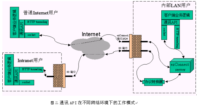 普通Internet用戶(例如撥號上網(wǎng)或小區(qū)ADSL)對Internet資源的訪問一般不受限制,所以只需解決如何穿越保衛(wèi)著ezConnect服務(wù)器的防火墻的問題。訊泰公司的方案是開發(fā)一套通用的通訊API, 在此API的基礎(chǔ)上實現(xiàn)呼叫中心客戶端的業(yè)務(wù)邏輯(參見下圖)。這個通訊API的底層有兩種方式:直接socket連接和HTTP隧道,API會自動檢測其所處的網(wǎng)絡(luò)環(huán)境來選擇適當?shù)牡讓舆B接方式。一般而言,保障著ezConnect服務(wù)器的防火墻應(yīng)該開放著ezConnect的協(xié)議端口2624。 所以普通Internet用戶訪問ezConnect系統(tǒng)時,客戶端軟件與服務(wù)器軟件通過建立直接的socket連接來互通信息。目標3由此達到。