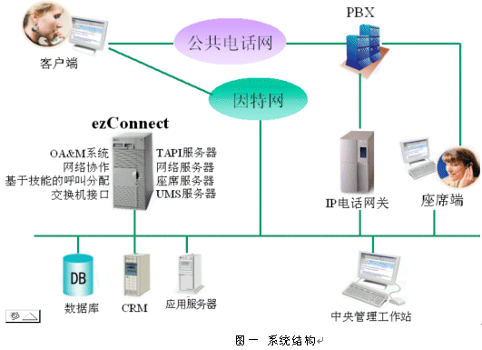 為了充分發(fā)揮現(xiàn)有系統(tǒng)的潛在能力,集成世界一流的產(chǎn)品以最大限度為客戶服務(wù),因特網(wǎng)呼叫中心的發(fā)展需要具備與多種系統(tǒng)交互的能力,充分發(fā)揮各種軟硬件的長處。電話和因特網(wǎng)呼叫中心解決方案ezConnect是按照工業(yè)標(biāo)準(zhǔn)設(shè)計的系統(tǒng),系統(tǒng)基于Windows NT操作系統(tǒng),采用廋客戶端設(shè)計思想設(shè)計,使用業(yè)界流行的Visual C++ 和Java實現(xiàn),可以作為開發(fā)平臺做二次開發(fā),也可以經(jīng)參數(shù)配置后直接投入使用。