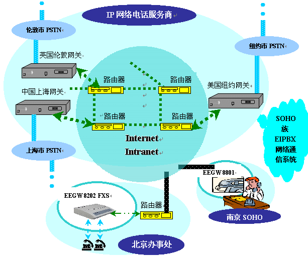 目前,在全球各地蓬勃發(fā)展起一項新興行業(yè)——IP網絡電話服務商,他們利用遍布全球、資源豐富的Internet / Intranet網絡,組織自己的IP電話核心網絡,將該網絡的服務開放給各地的公眾。其核心網絡的網關完全遵照ITU-T H.323標準,可以解決電話號碼與IP地址的映射,IP地址解析,路由尋路等問題。能夠實現(xiàn)SOHO族通過該網絡接入全球各地的市話。
