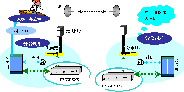 根據話音業(yè)務量的大小,在路由器或局域網交換機后端配置E1接口網關(EEGW 8601 E1、EEGW 8602 E1、EEGW 8604 E1)或FXO接口六路網關(EEGW 8566 FXO),然后連接企業(yè)交換機或集團電話。