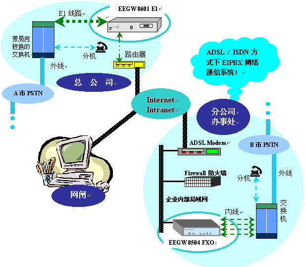 為實現(xiàn)地理位置分散的各企業(yè)分支機構間的語音通信,節(jié)約企業(yè)內部的通信成本和管理成本,許多公司在選擇ADSL或ISDN等其他寬帶接入技術接入Internet,同時希望利用該網絡建立內部的EIPBX網絡通信系統(tǒng)。
