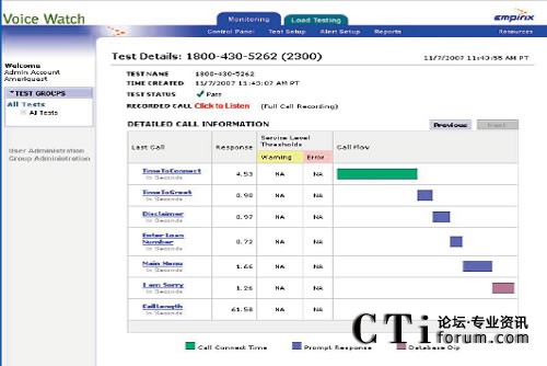 電話交易監(jiān)測(cè): 一個(gè)電話交易由一條指定的路由組成,呼叫者穿越這條路由,通過(guò)按鍵或語(yǔ)音完成一項(xiàng)自助服務(wù)的交易。對(duì)于每一個(gè)通話路由,Voice Watch被設(shè)計(jì)成通過(guò)撥號(hào)或者語(yǔ)音指定這條路由完成一項(xiàng)IVR自助服務(wù)的交易,例如賬戶余額檢查,賬單支付等。電話交易監(jiān)測(cè)管理自助服務(wù)的可用性和性能,也測(cè)量承載網(wǎng)的性能和交換機(jī)、IVR、語(yǔ)音識(shí)別和主機(jī)/數(shù)據(jù)庫(kù)的響應(yīng)時(shí)間。