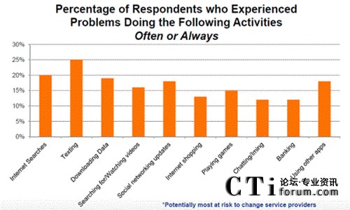 調(diào)查顯示,超過2/3的美國智能手機用戶從事一些最常見的活動時,遭遇了網(wǎng)絡(luò)服務(wù)問題,包括互聯(lián)網(wǎng)搜索、數(shù)據(jù)下載、搜尋或觀看視頻和社交網(wǎng)絡(luò)。此外,在調(diào)查中發(fā)現(xiàn),當他們遇到服務(wù)和中斷問題時,消費者把責任歸罪于他們的移動網(wǎng)絡(luò)運營商商(MNO)。事實上,幾乎所有被調(diào)查的智能手機用戶的一半,由于他們的體驗問題抱怨他們的移動網(wǎng)絡(luò)運營商商(MNO)。