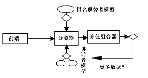 下圖說明了Nuance軟件的處理流程。語音前端處理后,分類器將講話者的語音特性和有關(guān)的講話者和冒名頂替者模型進(jìn)行比較,產(chǎn)生分值。