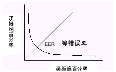 這些錯誤和兩種不同的用戶群有關(guān)。特別是,比如,0.2%的誤接納率,并不意味著0.2%的呼叫者能闖入系統(tǒng),而是0.2%的冒名頂替者企圖闖入。這比例往往只是呼叫者總數(shù)的一個零頭。安全性和方便性須得到折衷平衡。當(dāng)誤接納率接近零時,誤拒絕率則上升,反之亦然。曲線上誤接受和誤拒絕率相等的點(diǎn)叫等錯率(ERR)。