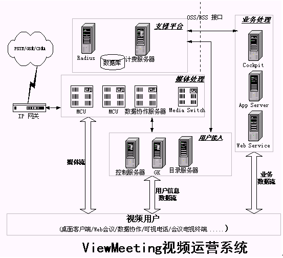 發(fā)展寬帶視頻業(yè)務,提供寬帶視頻通信解決方案是優(yōu)視風的宗旨,利用ViewMeeting平臺(如圖1所示),運營企業(yè)可以制定針對不同用戶需求的不同視頻業(yè)務,使視頻業(yè)務能夠普及到更廣的用戶范圍中。