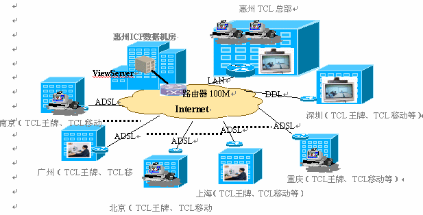 TCL集團(tuán)利用ViewMeeting實(shí)現(xiàn)可視協(xié)同辦公系統(tǒng)的組網(wǎng)圖: