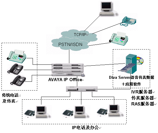 針對現(xiàn)代企業(yè)辦公通信的特點和要求,Avaya與Eicon經(jīng)過嚴格的產(chǎn)品互操作測試,及應用調(diào)試共同推出了企業(yè)一體化辦公平臺解決方案,該解決方案整合了兩家公司的交換機、語音傳真板卡的各自優(yōu)勢,既可以應用于傳統(tǒng)的網(wǎng)絡環(huán)境,又能應用于純IP的通信環(huán)境,將不同的應用技術和網(wǎng)絡結(jié)合起來,做到真正的辦公一體化。