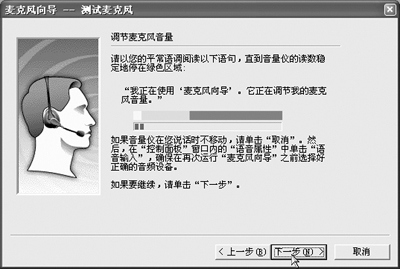 待音量?jī)x式穩(wěn)定后,點(diǎn)擊“下一步”測(cè)試麥克風(fēng)的安放位置,再次朗讀對(duì)話框中的例句,然后聽一下回放的錄音是否清晰。一切調(diào)整好后,點(diǎn)擊“完成”。