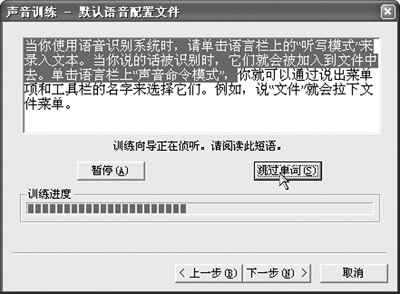 麥克風(fēng)設(shè)置完成以后,系統(tǒng)會(huì)進(jìn)行語音識(shí)別的訓(xùn)練。首先要求您確認(rèn)一些聲音基本信息,接著點(diǎn)擊“下一步”,系統(tǒng)給出一個(gè)例句,您可以點(diǎn)擊“示例”按鈕聽一聽?wèi)?yīng)該如何朗讀這樣的句子。之后,再次點(diǎn)擊“下一步”就可以開始語音訓(xùn)練了。