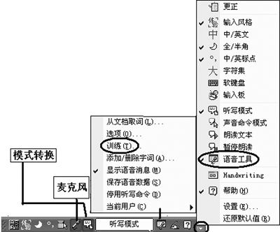 如果您以后想再次進(jìn)行語音訓(xùn)練,那么,可以點(diǎn)擊語言欄上的“語音工具”按鈕,然后單擊“訓(xùn)練”來對(duì)計(jì)算機(jī)進(jìn)行語音識(shí)別的訓(xùn)練(如圖3)。