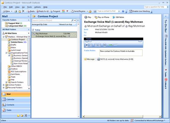 Outlook 2007,它將語(yǔ)音郵件作為優(yōu)先數(shù)據(jù)類型來(lái)集成。Outlook 2007 界面允許用戶連同其它數(shù)據(jù)項(xiàng)一起對(duì)語(yǔ)音郵件消息進(jìn)行排序、搜索和確定其優(yōu)先級(jí);此外,用戶可以在他們的座機(jī)上播放語(yǔ)音郵件消息,并向語(yǔ)音郵件消息添加附注,以便連同關(guān)聯(lián)的發(fā)件人和日期信息一起對(duì)消息內(nèi)容建立索引。(請(qǐng)參見(jiàn)圖2)Outlook