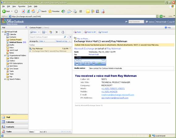 圖3:Outlook Web Access 2007 提供了語(yǔ)音郵件消息的直接可訪問(wèn)視圖