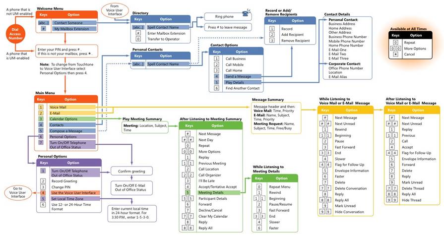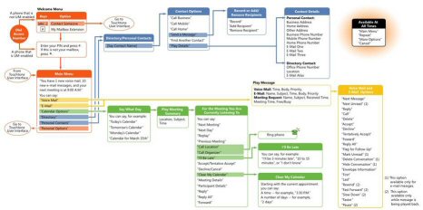 允許用戶通過(guò)電話處理他們的消息和日歷數(shù)據(jù)(包括收聽、轉(zhuǎn)發(fā)和回復(fù)電子郵件,以及發(fā)出、更新或響應(yīng)會(huì)議請(qǐng)求)。用戶可以標(biāo)記消息以便跟蹤、跳到下一封未讀郵件、隱藏或刪除對(duì)話,甚至查找來(lái)自特定用戶的消息,這一切全都使用語(yǔ)音導(dǎo)航或標(biāo)準(zhǔn)按鍵式鍵盤來(lái)完成。