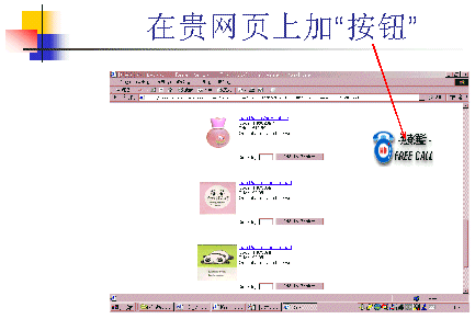 簡單地說,就是當(dāng)有客戶瀏覽到網(wǎng)上購物的網(wǎng)頁時(shí),若有任何疑問或想立即購買,只要點(diǎn)擊在網(wǎng)頁上的“按鈕”鍵,就可以直接接通到網(wǎng)站的客服中心,實(shí)現(xiàn)即時(shí)地語音互動(dòng)。也不需再像以前那樣發(fā)E-MAIL或撥電話號(hào)碼了。效果可謂是立竿見影。(如圖示)