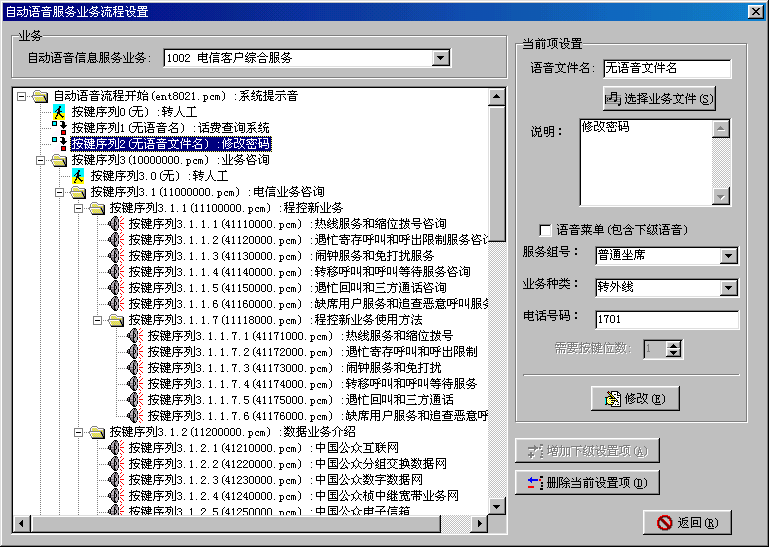 。。編制成功的業(yè)務(wù)流程由業(yè)務(wù)處理點(diǎn)在線加載執(zhí)行,保證系統(tǒng)功能的動(dòng)態(tài)擴(kuò)充。可在線加載自動(dòng)業(yè)務(wù),多種自動(dòng)業(yè)務(wù)在動(dòng)態(tài)加載時(shí),為不影響正在處理的呼叫,可多版本運(yùn)行,舊版本業(yè)務(wù)的呼叫處理全部結(jié)束后,舊版本業(yè)務(wù)自動(dòng)升級(jí)。